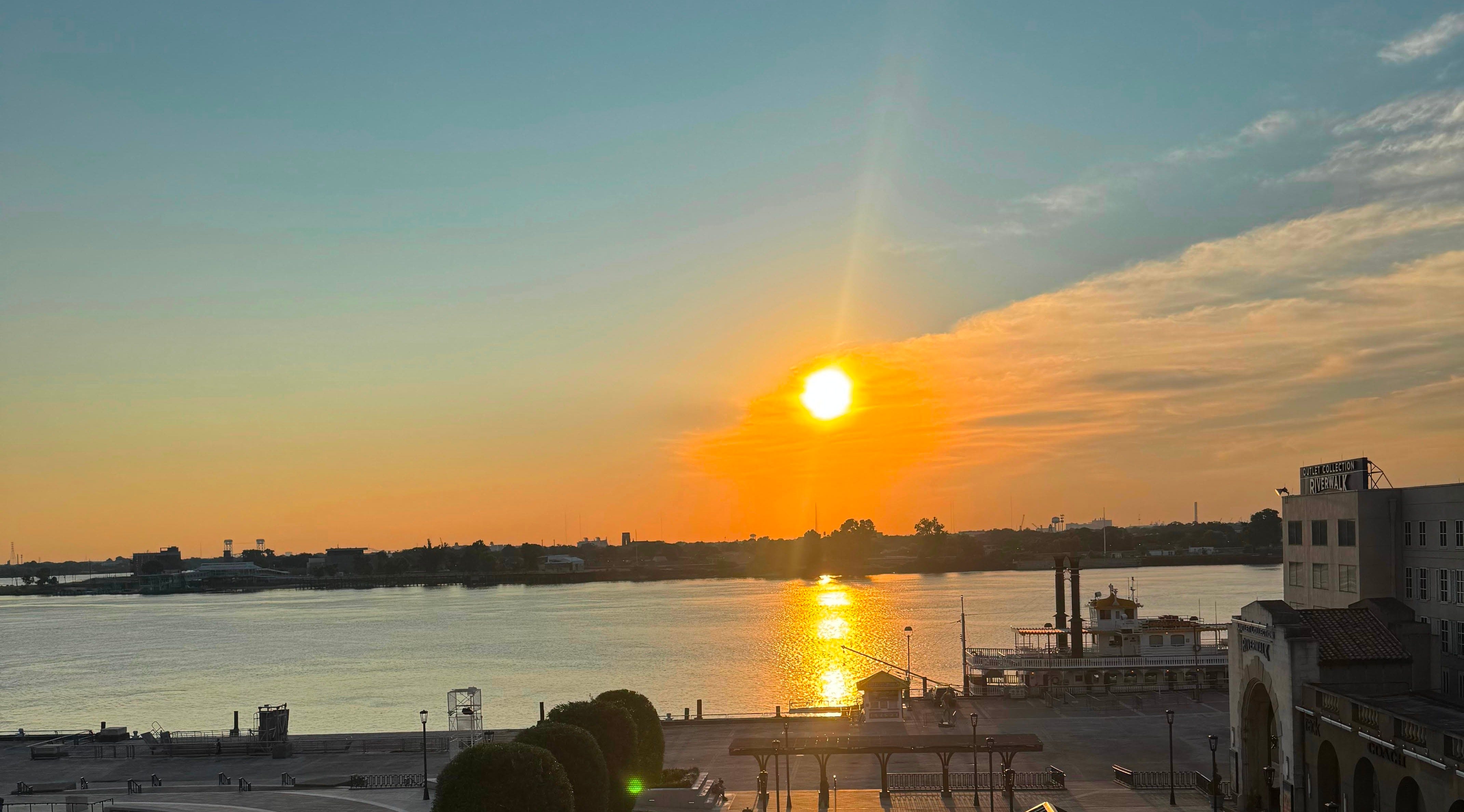 I’m watching the slow-moving tugboats push shipping containers through the muddy traverse, navigating the sinuous arc of this mighty river, an effect that gives NOLA its same-shaped moniker, The Crescent City.