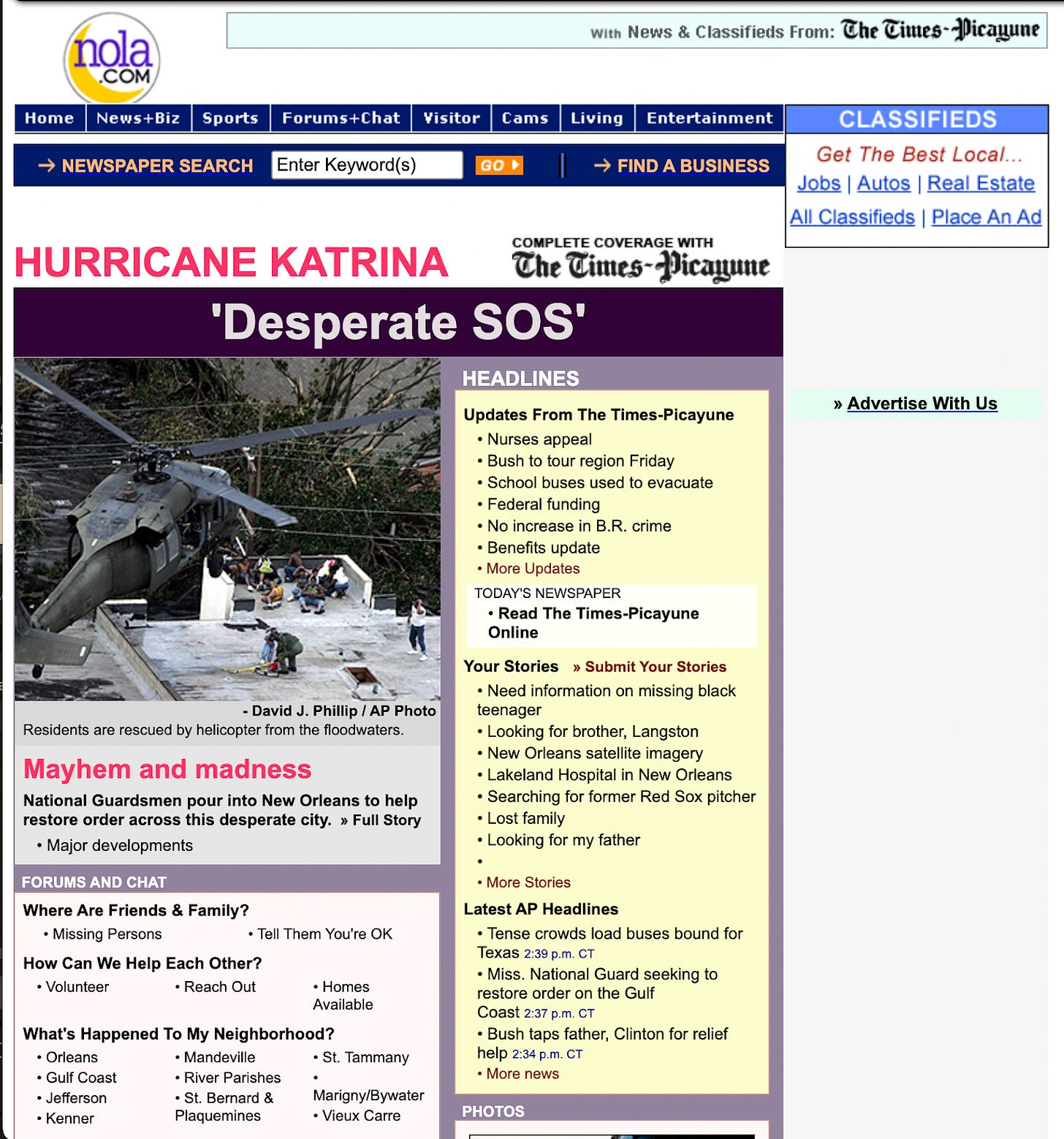 When Katrina first hit, most of the digital staff was evacuated and we thought maybe we’d dodged a bullet. But later Monday evening, after landfall, my editor started messaging me via AOL Instant Messenger. This was our comms platform and the real-time tech used across our displaced newsroom.