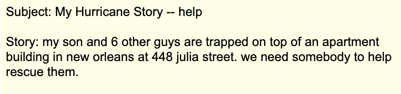 At first it was a trickle of a few eerie messages about rising water and loved ones left behind needing rescue, but then they started coming en masse, and we made the editorial decision to publish them all, fully unedited and with no redaction. Every minute mattered in terms of getting these details up and the more information about the circumstances and location, the better.