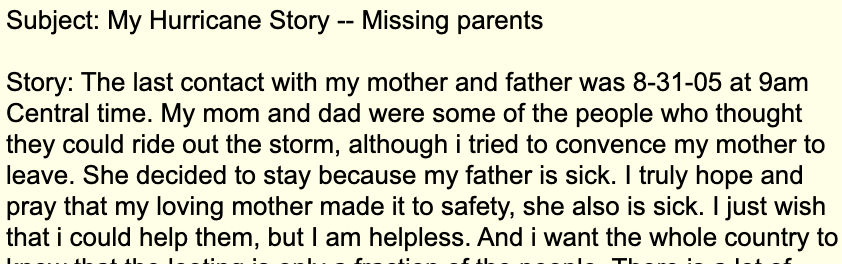 I had just finished working a shift of cutting and pasting, and was watching CNN when the anchor cut to a Coast Guard member in a helicopter holding up a printout of our blog — the very same Cries for Help blog I had cut and pasted into minutes before. They were using these addresses to find people.
